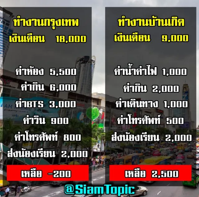 แต่พนักงานบริษัทที่มีเงินเดือนหลายหมื่นนั้นกลับไม่พอใช้ บางรายก็ชักหน้าไม่ถึงหลังเพราะค่าครองชีพที่กรุงเทพฯนั้นพุ่งสูงมาก เพราะทุกคนนั้นล้วนต้องซื้อกิน ซื้อใช้ และไหนจะเป็นค่าเดินทางไปทำงาน ทุกๆอย่างก็ล้วนแต่ต้องใช้เงิน ในวันนี้ทาง สยามทอปปิค จึงได้นำอัตราเงินเดือนระหว่างคนที่ทำงานในกรุงเทพที่เงินเดือน 18,000 กับคนที่ทำงานอยู่แถวบ้าน เงินเดือน 9,000 เรามาเปรียบเทียบดูกันว่า ระหว่างทำงานอยู่ในเมืองกรุงกับทำแถวบ้าน จะต่างกันมากน้อยขนาดไหน