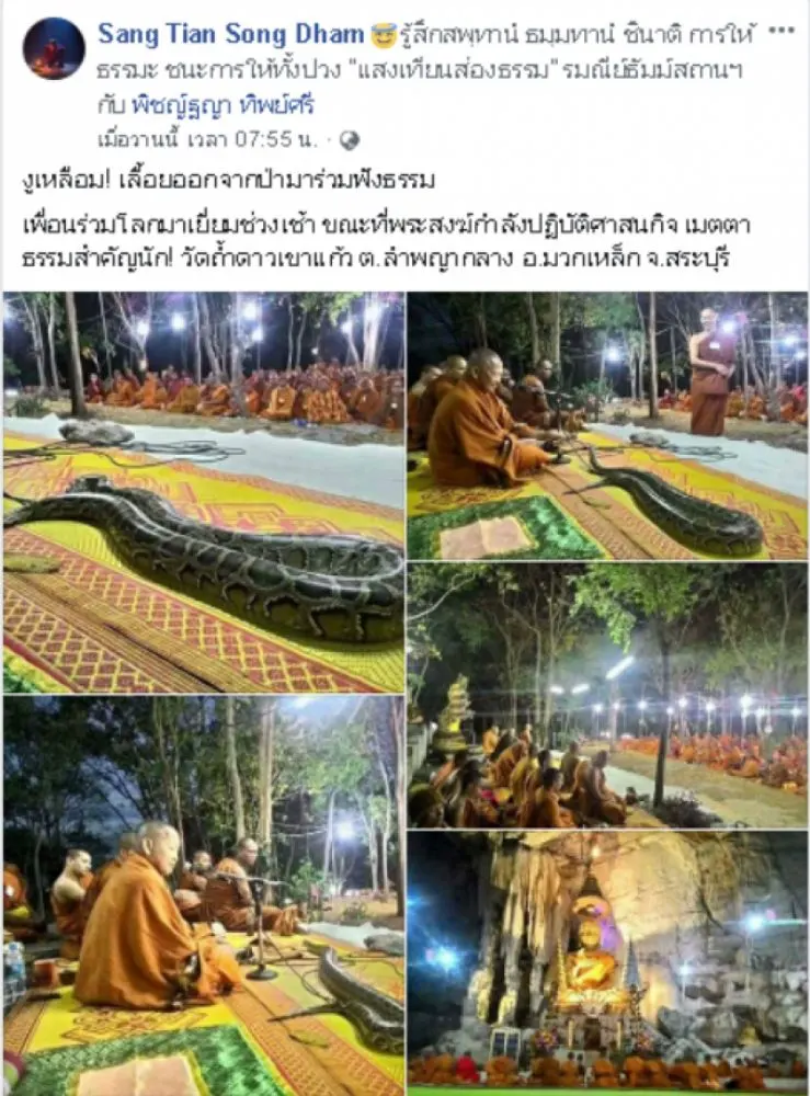 11 มิถุนายน 2562 เพจผู้ใช้เฟซบุ๊กชื่อ Sang Tian Song Dham ได้โพสภาพเหตุการณ์ขณะที่พระสงฆ์สวดมนต์ทำพิธียามค่ำ โดยได้ระบุข้อความว่า งูเหลือม! เลื้อยออกจากป่ามาร่วมฟังธรรม เพื่อนร่วมโลกมาเยี่ยมช่วงเช้า ขณะที่พระสงฆ์กำลังปฏิบัติศาสนกิจ ณ วัดถ้ำดาวเขาแก้ว ต.ลำพญากลาง อ.มวกเหล็ก จ.สระบุรี