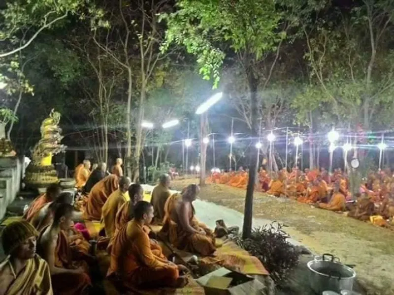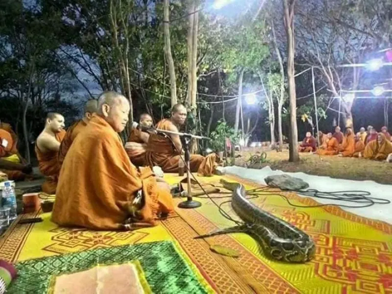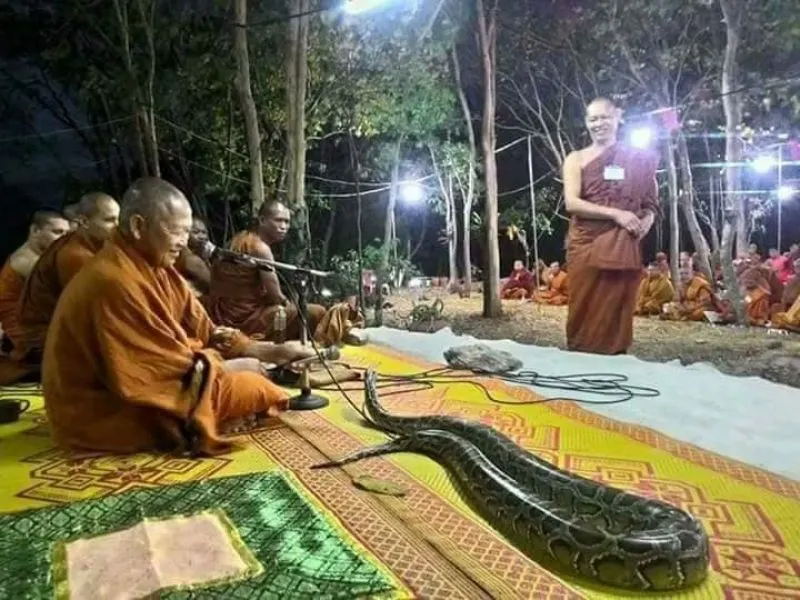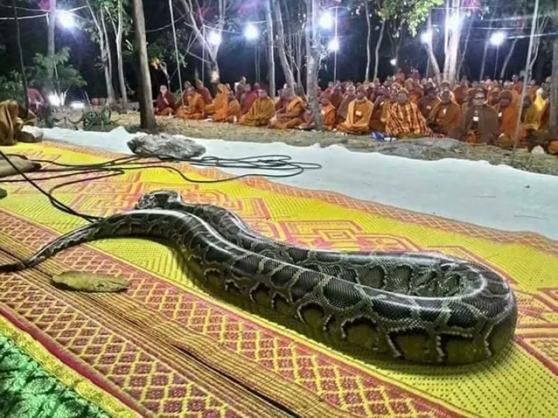 สาธุๆ งูเหลือมตัวใหญ่เลื้อยออกมาฟังธรรม กลางวงพระสงฆ์