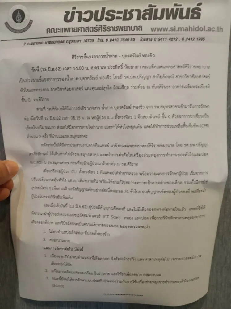 แรกเริ่้ม ภายในร่างกายเลือดมีภาวะเป็นกรดสูง มีแก๊สของเสียในร่างกายจำนวนมาก จำเป็นต้องใส่เครื่องช่วยเพื่อฟอกเลือด จึงสามารถเคลื่อนย้ายได้โดยได้รับความช่วยเหลือ จาก รพ.กรุงเทพ เมื่อมาถึง รพ.ศิริราช จึงได้ปรับยา แก้ไขความดันที่ขึ้นลงตลอดเวลา จนเช้าที่ผ่านมา ทุกอย่างเริ่มนิ่่ง จึงตรวจสาเหตุการเลือดออกแต่ยังไม่พบ