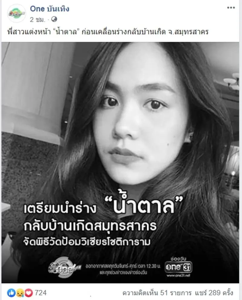 ซึ่งทางเพจOne บันเทิง ได้ออกมาโพสต์ข้อความไว่ว่า " พี่สาวแต่งหน้า น้ำตาล ก่อนเคลื่อนร่างกลับบ้านเกิด จ.สมุทรสาคร ซึ่งจัดจัดพิธีที่วัดป้อมโชติการาม" ซึ่งืำเอาชาวโซเชียลแห่แสดงความเสียใจเป็นจำนวนมาก