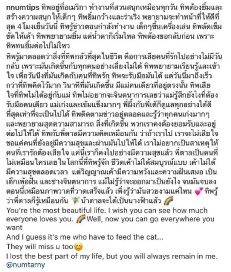 ทิพไม่อยากจะจินตนาการเลยว่าแม่รู้สึกยังไงที่ต้องรับมือคนเดียว แม่เก่งและเข้มแข็งมากๆ พี่ผึ้งกับพี่เต้ก็ดูแลทุกอย่างได้ดีที่สุดเท่าที่จะเป็นไปได้ ทิพติดตามข่าวอยู่ตลอดและรู้ว่าทุกคนเก่งมากๆ และพยายามสุดความสามารถ สิ่งที่เกิดขึ้น พวกเราคงต้องยอมรับและอยู่ต่อไปให้ได้ ทิพกับพี่ตาลมีความคิดเหมือนกัน
