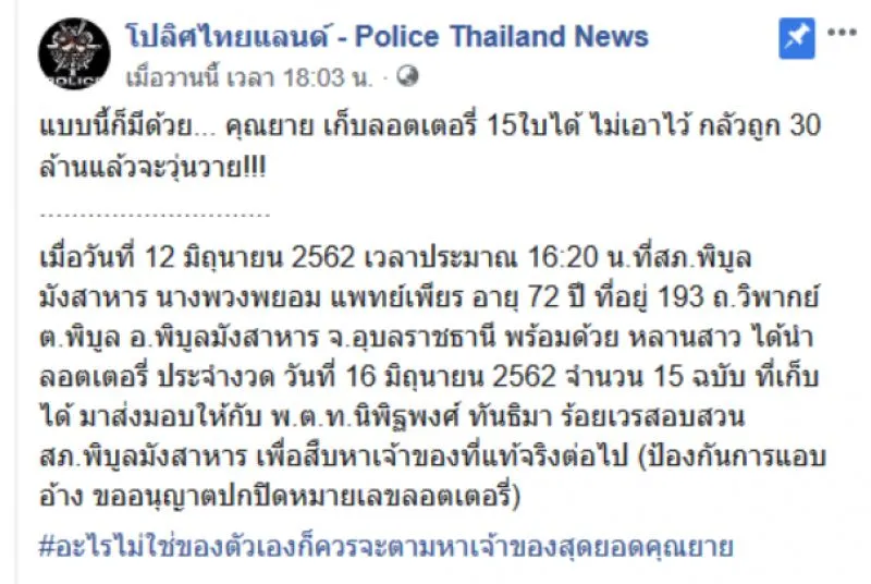 12 มิถุนายน 2562 เวลาประมาณ 16:20 น.ที่สภ.พิบูลมังสาหาร นางพวงพยอม แพทย์เพียร อายุ 72 ปี ที่อยู่ 193 ถ.วิพากย์ ต.พิบูล อ.พิบูลมังสาหาร จ.อุบลราชธานี พร้อมด้วย หลานสาว ได้นำลอตเตอรี่ ประจำงวด วันที่ 16 มิถุนายน 2562 จำนวน 15 ฉบับ ที่เก็บได้ มาส่งมอบให้กับ พ.ต.ท.นิพิฐพงศ์ ทันธิมา ร้อยเวรสอบสวน สภ.พิบูลมังสาหาร เพื่อสืบหาเจ้าของที่แท้จริงต่อไป (ป้องกันการแอบอ้าง ขออนุญาตปกปิดหมายเลขลอตเตอรี่) #อะไรไม่ใช่ของตัวเองก็ควรจะตามหาเจ้าของสุดยอดคุณยาย