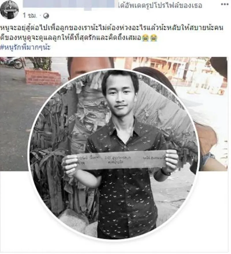 พร้อมระบุว่า “หนูจะอยู่สู้ต่อไปเพื่อลูกของเรานะ ไม่ต้องห่วงอะไรแล้วนะ หลับให้สบายนะคนดีของหนู หนูจะดูแลลูกให้ดีที่สุด รักและคิดถึงเสมอ หนูรักพี่มากๆนะ”