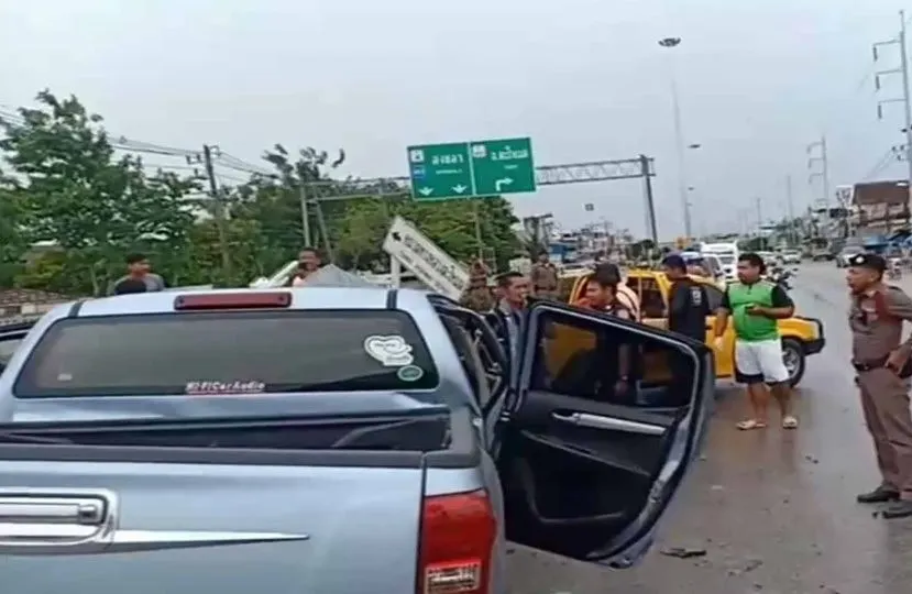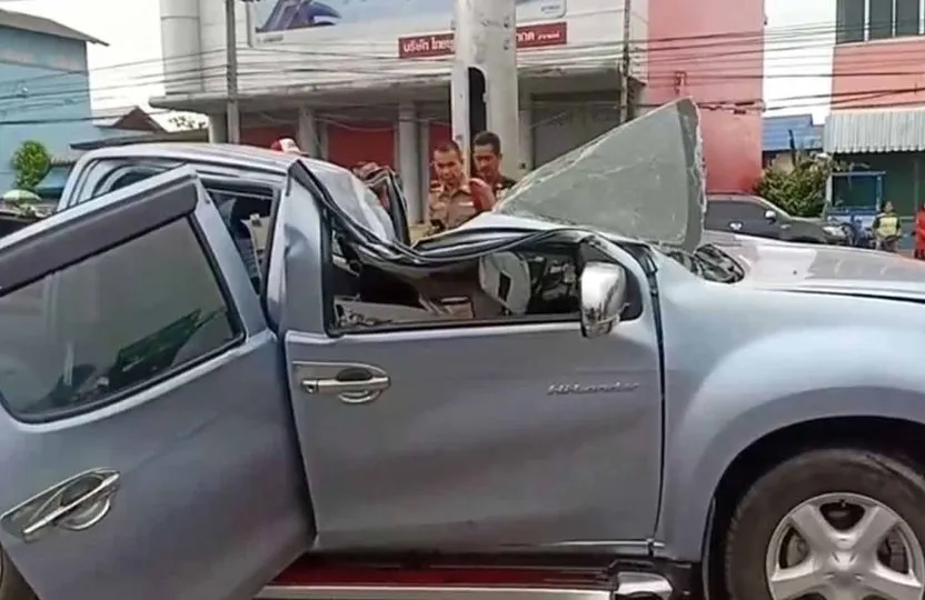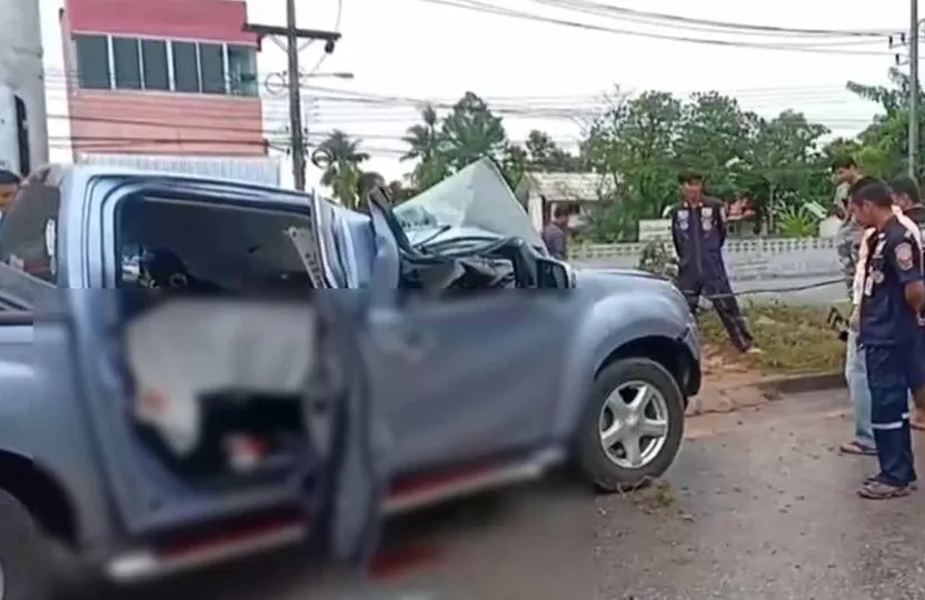 รถกระบะเสียหลักพุ่งชนเสาไฟอย่างแรง พ่อเสียชีวิต แม่และลูกบาดเจ็บ