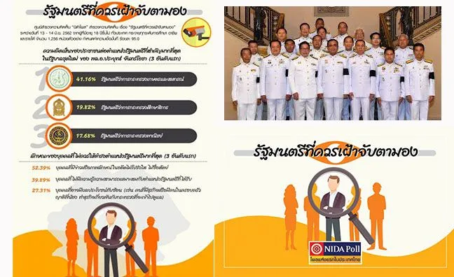 16 มิถุนายน 2562-ศูนย์สำรวจความคิดเห็น “นิด้าโพล” สถาบันบัณฑิตพัฒนบริหารศาสตร์ (นิด้า) เปิดเผยผลสำรวจความคิดเห็นของประชาชน เรื่อง “รัฐมนตรีที่ควรเฝ้าจับตามอง” ทำการสำรวจระหว่างวันที่ 13-14 มิถุนายน 2562 จากประชาชนที่มีอายุ 18 ปีขึ้นไป ทั่วประเทศ กระจายทุกภูมิภาค ระดับการศึกษา และอาชีพทั่วประเทศ รวมทั้งสิ้น จำนวน 1,256 หน่วยตัวอย่าง เกี่ยวกับรัฐมนตรีที่ควรเฝ้าจับตามอง ในรัฐบาล ชุดใหม่ของ พล.อ.ประยุทธ์ จันทร์โอชา