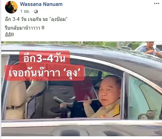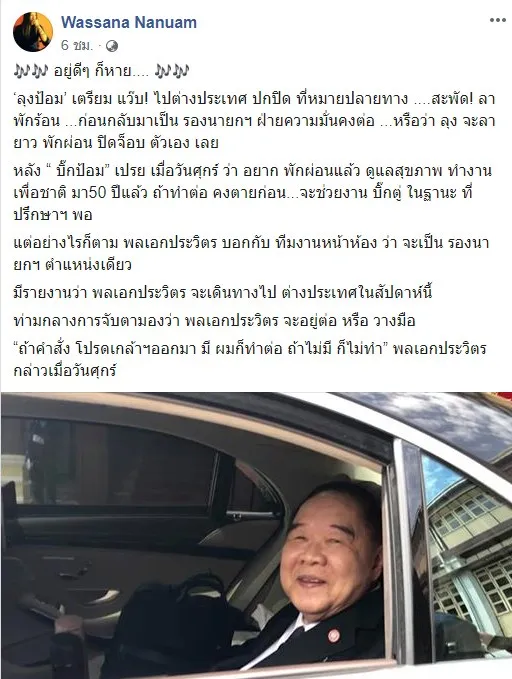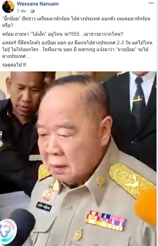 17 มิ.ย. 2562 วาสนา นาน่วมผู้สื่อข่าวสายทหาร โพสท์เฟซบุ๊กระบวุ่า🎶🎶 อยู่ดีๆ ก็หาย.... 🎶🎶 ‘ลุงป้อม’ เตรียม แว๊บ! ไปต่างประเทศ ปกปิด ที่หมายปลายทาง ....สะพัด! ลาพักร้อน ...ก่อนกลับมาเป็น รองนายกฯ ฝ่ายความมั่นคงต่อ ...หรือว่า ลุง จะลายาว พักผ่อน ปิดจ็อบ ตัวเอง เลย