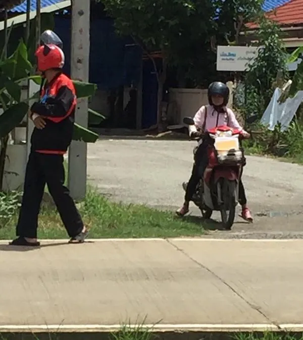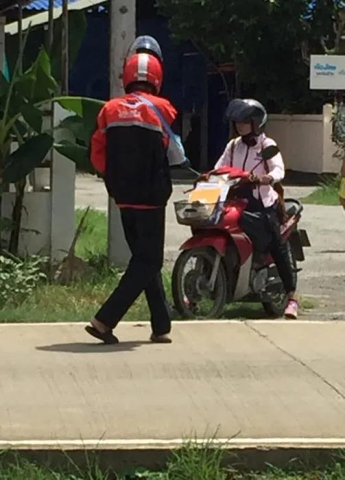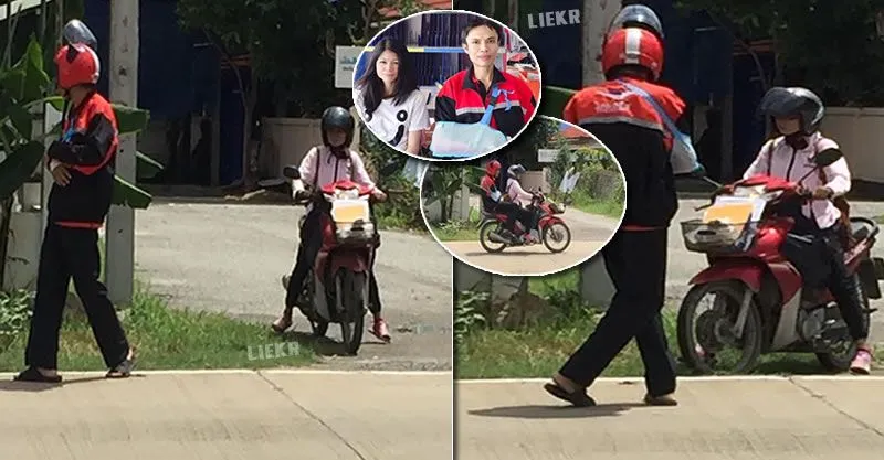 สุดยอดไปรษณีย์บ้านพี่ แขนใส่เฝือกขี่รถเครื่องเองไม่ได้แต่ยังคงทำหน้าที่ส่งของให้ถึงลูกค้า โดยให้แฟน (คิดว่าคงใช่แฟน) ขี่รถให้ รักนะไปรษณีย์ไทย ♥♥♥ พิกัดหลังโรงเรียนวัดขี้เหล็ก” แคปชั่นของโพสต์