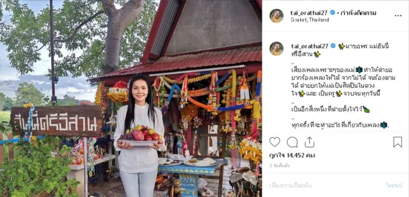 วันที่ 18 มิถุนายน เพจผู้ใช้อินสตาแกรมชื่อ tai_orathai27 ได้เผยแพร่เรื่องราว ขณะไปไหว้ขอพร นักร้องลูกทุ่งหมอลำ "ฮันนี่ ศรีอีสาน" ที่จ.ศรีสะเกษ ด้วยผลไม้หลากหลายชนิด เพื่อเป็นกำลังใจขึ้นคอนเสิร์ตใหญ่เมื่อในวันที่ 22 มิ.ย.ที่จะถึงนี้ โดยได้โพสต์ระบุข้อความว่า มาขอพร แม่ฮันนี่ ศรีอีสาน เสียงเพลงเพราะๆของแม่ทำให้ต่ายอยากร้องเพลงให้ได้ จากไม่ได้ จนร้องตามได้ ต่ายยกให้แม่เป็นศิลปินในดวงใจและ เป็นครูจวบจนทุกวันนี้ เป็นอีกสิ่งหนึ่งที่ต่ายตั้งใจไว้ ทุกครั้งที่จะทำอะไรที่เกี่ยวกับเพลงการทำงานชิ้นใดๆหรือ แม้แต่คอนเสิร์ตใหญ่ครั้งนี้ก็ตาม ต่ายก็ได้มาทำตามที่ตั้งใจไว้แล้ว มาบอกกล่าวแม่ ว่าจะมีคอนเสิร์ตใหญ่เป็นของตัวเองครั้งแรก ขอให้งานวันคอนเสิร์ตผ่านไปได้ด้วยดี ราบรื่น เรียบร้อยทุกอย่าง อย่าได้มีอุปสรรค ขอให้แฟนเพลงประทับใจ ขอให้ลูกมั่นใจและทำออกมาให้ดีที่สุด สาธุ