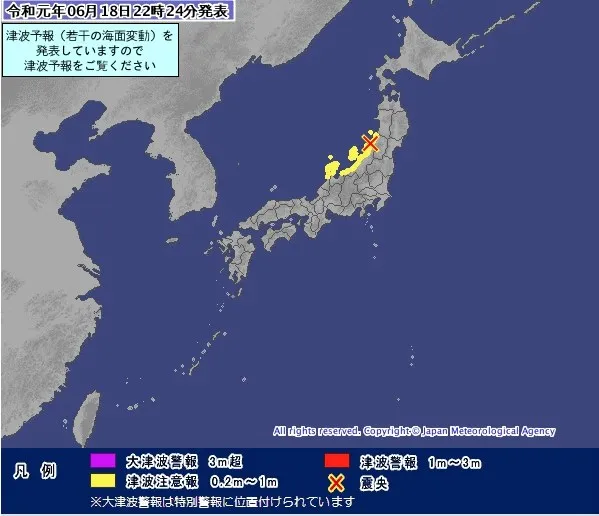 วลา 22.22 น. วันนี้ (18 มิ.ย. 2562) เกิดแผ่นดินไหวระดับ 6.8 ที่ Niigata และ Yamagata และขณะนี้มี Tsunami ความสูง 1 เมตร. ถึงแล้วที่ อ. Tsuruoka จ. Yamagata และ เกาะ Awa ที่ จ. Niigata