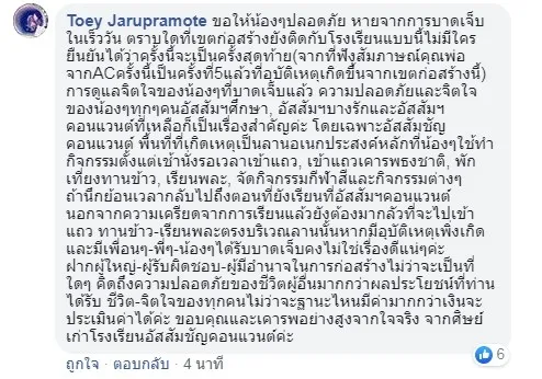 ทั้งนี้ผู้ใช้เฟซบุ๊กที่ชื่อว่า “Toey Jarupramote” ออกมาแสดงความเห็นเพิ่มเติมว่า “ขอให้น้องๆปลอดภัย หายจากการบาดเจ็บในเร็ววัน ตราบใดที่เขตก่อสร้างยังติดกับโรงเรียนแบบนี้ไม่มีใครยืนยันได้ว่าครั้งนี้จะเป็นครั้งสุดท้าย(จากที่ฟังสัมภาษณ์คุณพ่อจากACครั้งนี้เป็นครั้งที่5แล้วที่อุบัติเหตุเกิดขึ้นจากเขตก่อสร้างนี้) การดูแลจิตใจของน้องๆที่บาดเจ็บแล้ว ความปลอดภัยและจิตใจของน้องๆทุกๆคนอัสสัมฯศึกษา, อัสสัมฯบางรักและอัสสัมฯคอนแวนต์ที่เหลือก็เป็นเรื่องสำคัญค่ะ โดยเฉพาะอัสสัมชัญคอนแวนต์ พื้นที่ที่เกิดเหตุเป็นลานอเนกประสงค์หลักที่น้องๆใช้ทำกิจกรรมตั้งแต่เช้านั่งรอเวลาเข้าแถว, เข้าแถวเคารพธงชาติ, พักเที่ยงทานข้าว, เรียนพละ, จัดกิจกรรมกีฬาสีและกิจกรรมต่างๆ