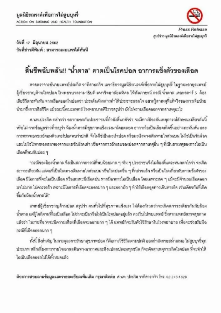 ศ.นพ.ประกิต เผยสาเหตุการเสียชีวิตของ น้ำตาล เดอะสตาร์ และให้คำแนะนำกับคนที่ไอเป็นเลือด