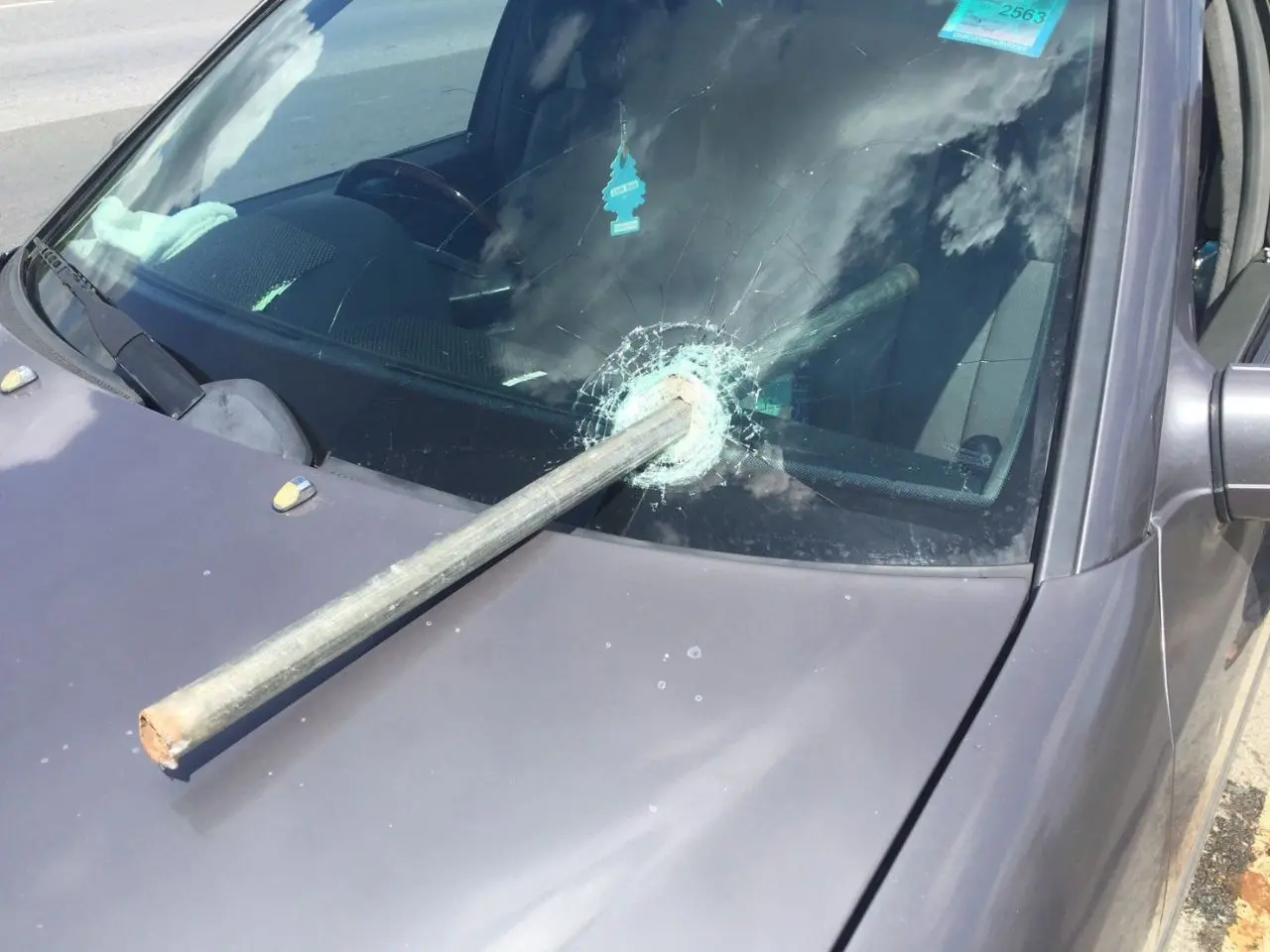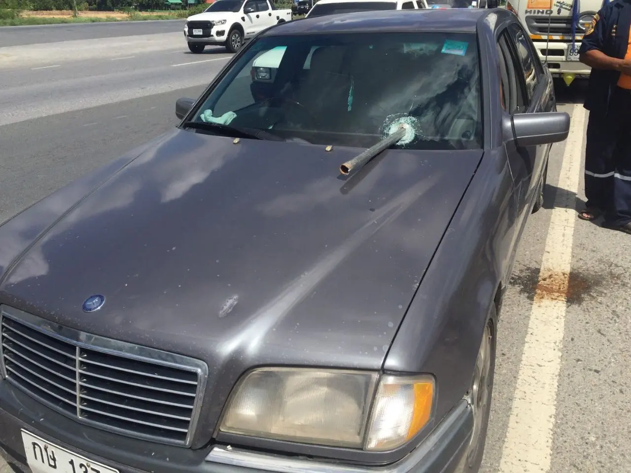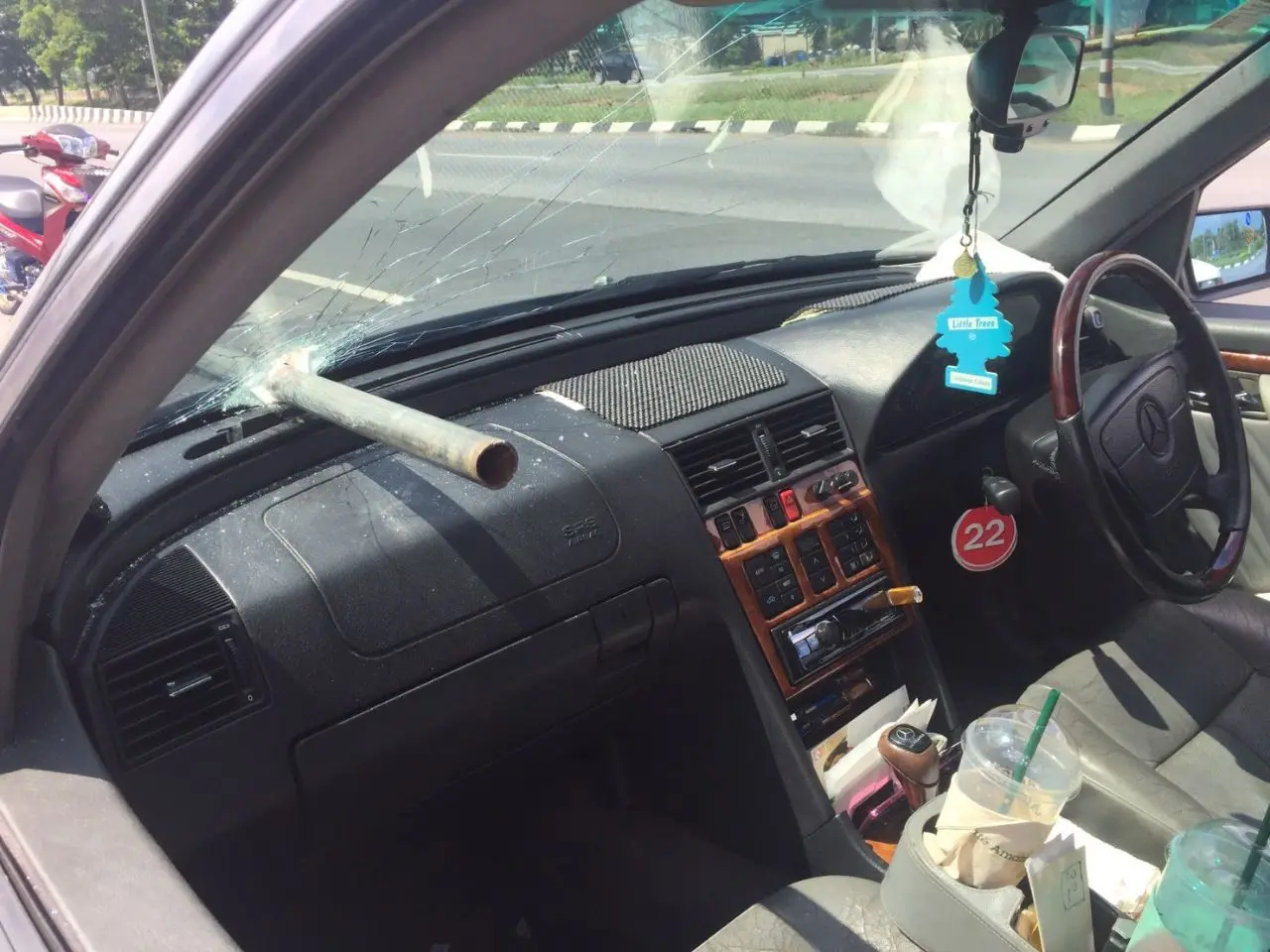 เกิดเหตุ..ท่อแป๊ปเหล็กรถเทรลเลอร์พุ่งเสียบกระจกรถเบนซ์ทิ่มสาวนั่งคู่บาดเจ็บสาหัส