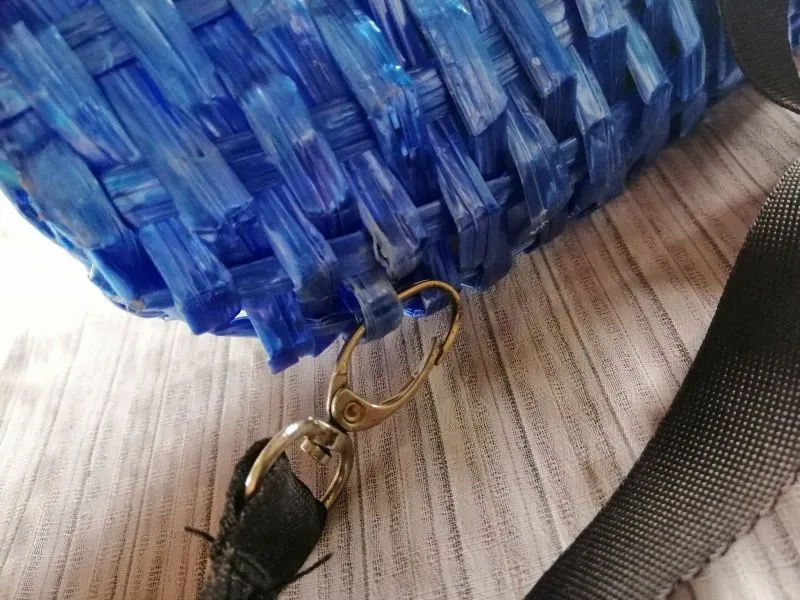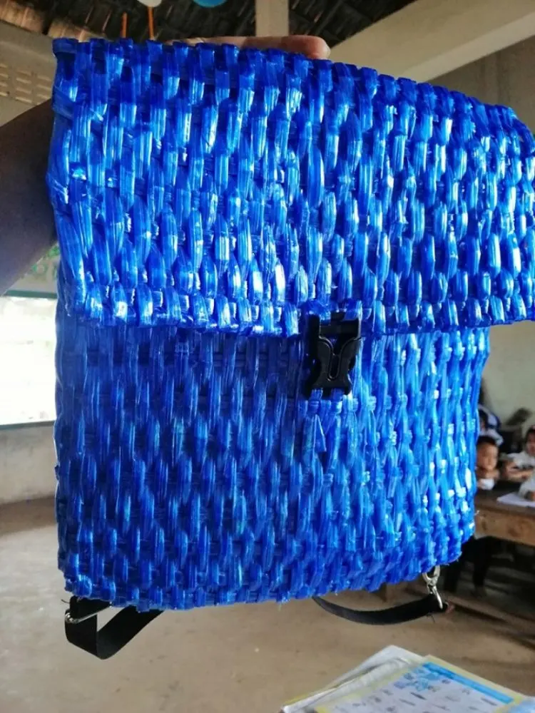 แต่เมื่อเราสังเกตุรายละเอียดของกระเป๋าใบนี้แล้ว เราจะเห็นความบรรจงที่ใส่ใจในรายละเอียด โดยวัสดุหลักที่ใช้ทำกระเป๋าคือเชือกฟาง กับตัวล็อกที่นำออกมาจากกระเป๋าใบอื่นที่ชำรุด บวกกับงานถักสานที่สวยงาม จนทำให้กระเป๋าของหนุ่มน้อยคนนี้โดดเด่นไม่เหมือนใคร