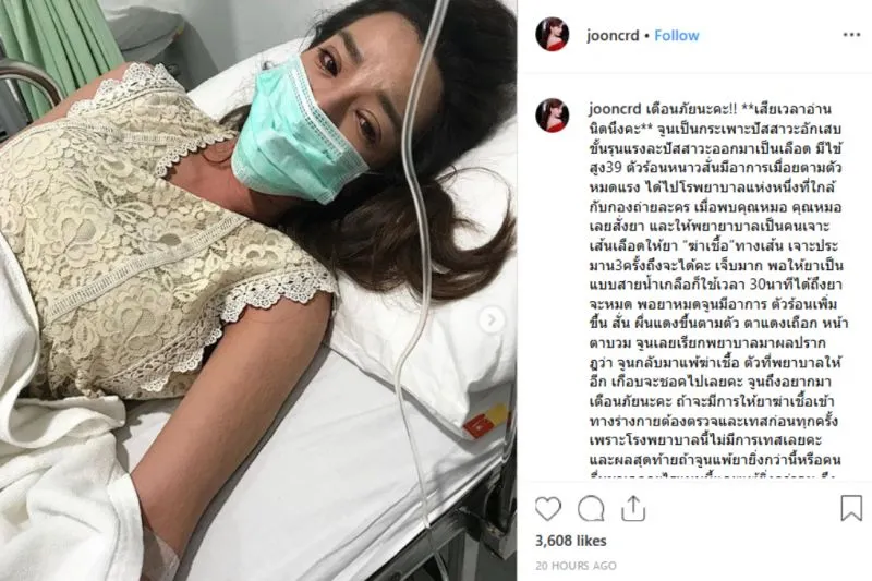 เตือนภัยนะคะ เสียเวลาอ่านนิดนึงคะ จูนเป็นกระเพาะปัสสาวะอักเสบขั้นรุนแรงละปัสสาวะออกมาเป็นเลือด มีไข้สูง39 ตัวร้อนหนาวสั่นมีอาการเมื่อยตามตัว หมดแรง ได้ไปโรพยาบาลแห่งหนึ่งที่ใกล้กับกองถ่ายละคร เมื่อพบคุณหมอ คุณหมอเลยสั่งยา และให้พยายาบาลเป็นคนเจาะเส้นเลือดให้ยา “ฆ่าเชื้อ”ทางเส้น เจาะประมาน3ครั้งถึงจะได้คะ เจ็บมาก