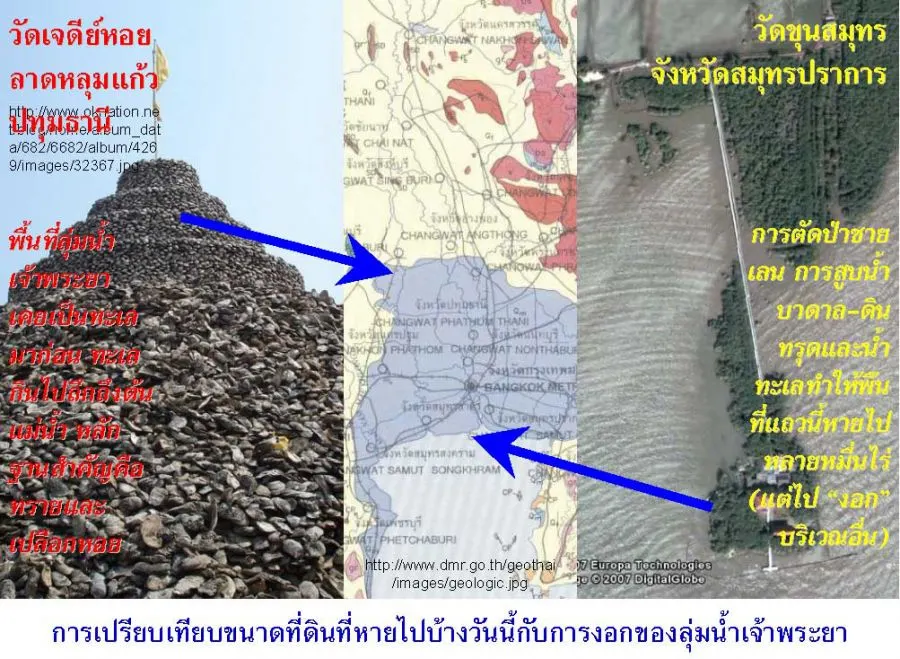 ตัวอย่างหนึ่งที่น่าสนใจก็คือวัดเจดีย์หอยที่ตั้งอยู่ชายแดนปทุมธานีกับอยุธยานั้น มีหอยนางรม มีทรายมากมายเป็นประจักษ์หลักฐานสำคัญว่าทะเลเคยกินลึกเข้าไปถึงวัดนี้ซึ่งห่างจากทะเลถึง 70 กิโลเมตร หรือถึงนครสวรรค์เลยทีเดียว ในความเป็นจริง ตลอดประวัติศาสตร์ที่ผ่านมา ทะเลถูกแผ่นดินกินไปต่างหาก เพียงแต่ไม่กี่ปีหลังมานี้ มีการตัดป่าไม้โกงกางเพื่อการเลี้ยงกุ้งหรือเกษตรกรรมอื่น ๆ มาก จึงเกิดการกัดเซาะชายฝั่ง ไม่ได้มีปัญหาเรื่องโลกร้อนแต่อย่างใด