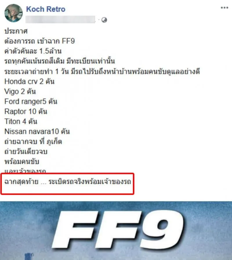 หนุ่มประกาศ ต้องการรถเข้าฉาก FF9 ค่าตัวคันละ 1.5 ล้าน
