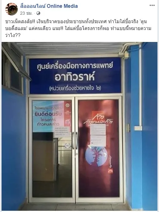 เฟซบุ๊กแฟนเพจสื่อออนไลน์ Online Media โพสท์ภาพทางเข้าศูนย์เครื่องมือทางการแพทย์ ที่มีชื่อ อาทิวราห์ ซึ่งเป็นชื่อของตูน บอดี้แสลม พร้อมข้อความระบุว่า ชาวเน็ตสงสัย!! เงินบริจาคของประชาชนทั้งประเทศ ทำไมใส่ชื่อจริง 'ตูน บอดี้สแลม' แค่คนเดียว แนะ!! ใส่แต่ชื่อโครงการก็พอ ทำแบบนี้หมายความว่าไง??