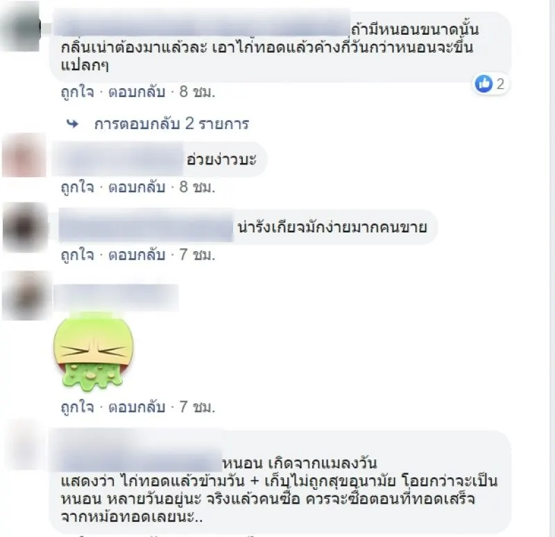 เมื่อวันที่ 20 มิถุนายน 2562 ผู้ใช้เฟซบุ๊กชื่อ Threerawat Chompoowong ได้โพสต์ภาพพร้อมข้อความเล่าถึงเหตุการณ์ขณะที่ตัวเขาเองไปซื้อไก่ทอดจากร้านแห่งหนึ่งมากิน แต่เมื่อกำลังจะกินกลับต้องสะดุ้งตกใจสุด ๆ เมื่อพบว่าไก่ทอดในมือเต็มไปด้วยหนอนสีขาวตัวเล็ก ๆ จำนวนมากไต่ยั้วเยี้ย พร้อมกับกลิ่นของไก่ที่เหมือนกำลังจะเน่า พร้อมระบุข้อความว่า...