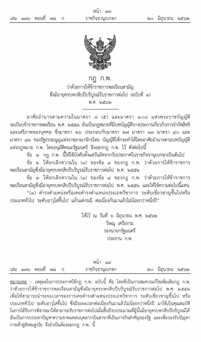 ราชกิจจานุเบกษา เผยแพร่ กฎ ก.พ. ว่าด้วยการให้ข้าราชการพลเรือนสามัญ ซึ่งมีอายุครบ 60 ปีบริบูรณ์รับราชการต่อ (ฉบับที่ 3) พ.ศ. 2562 โดยอาศัยอำนาจตามมาตรา 8 (5) และมาตรา 108 แห่ง พ.ร.บ.ระเบียบข้าราชการพลเรือน พ.ศ. 2551 อันเป็นกฎหมายกฎหมายที่มีบทบัญญัติบางประการเกี่ยวกับการจำกัดสิทธิและเสรีภาพของบุคคล ซึ่งมาตรา 26 ประกอบกับมาตรา 27 มาตรา 33 มาตรา 40 และมาตรา 43 ของรัฐธรรมนูญแห่งราชอาณาจักรไทย บัญญัติให้กระทำได้โดยอาศัยอำนาจตามบทบัญญัติแห่งกฎหมาย ก.พ. โดยอนุมัติคณะรัฐมนตรี จึงออกกฎ ก.พ. ไว้ ดังต่อไปนี้