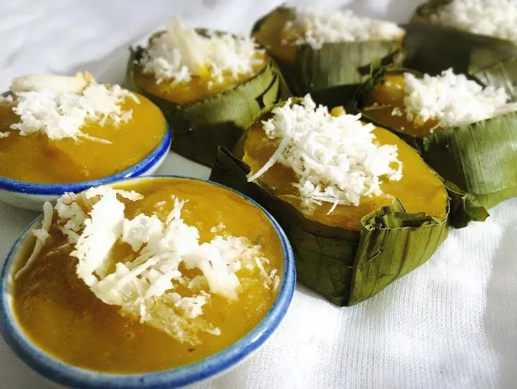 หากใครอยากให้ขนมออกมาดูเป็นแบบไท ยๆมากขึ้น ให้ใช้วิธีนึ่งด้วย “กรวยใบตอง” ซึ่งมีวิธีการทำดังต่อไปนี้