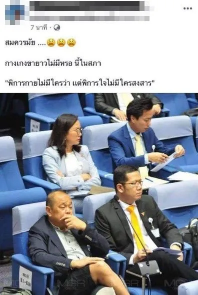 ข้อความจากเพจการเมืองดังกล่าวแคปภาพจากสื่อแห่งหนึ่ง พร้อมโจมตี นายจุลพันธ์ โนนศรีชัย ส.ส.ปาตี้ลิสท์ พรรคอนาคตใหม่ ระบุว่า “สมควรมั้ย…กางเกงขายาวไม่มีเหรอ นี้ในสภา “พิการกายไม่ว่า แต่พิการใจไม่มีใครสงสาร”