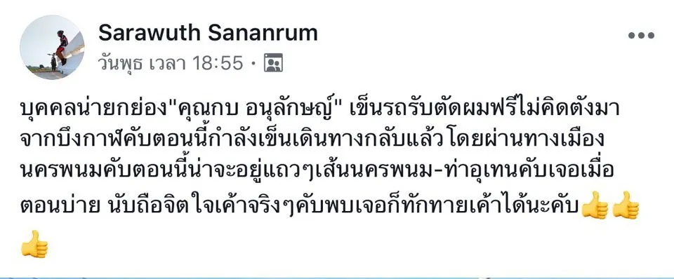 น่ายกย่องมากๆ เมื่อผู้ใช้เฟสบุ๊ค ชื่อ Sarawuth Sunanrum ได้ออกมาเผยแพร่โพสต์ผ่านกลุ่ม ชื่อ nakhonphanom talk of the town ซึ่งเป็นเรื่องราวดีๆ ของหนุ่ม บึงกาฬ ใจบุญ เข็นรถรับตัดผมฟรี ไม่คิดเงิน สุดยอดจริงๆ โดยผู้ใจเฟสบุ๊คดังกล่าว ได้ระบุข้อความเอาไว้ว่า