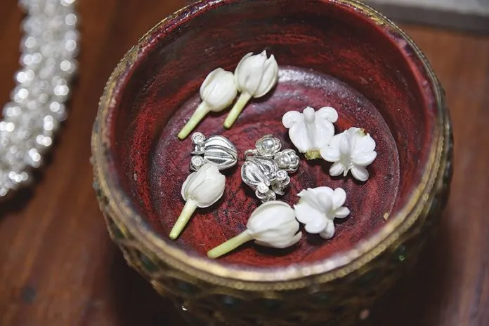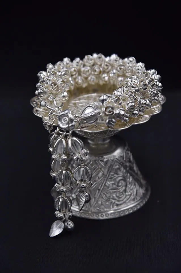 ผลงานแต่ละชิ้นสร้างสรรค์โดยครูนฤมล ทอนใจ ซึ่งได้รับเชิดชูเป็นครูช่างศิลปหัตถกรรมประเภทเครื่องโลหะ (เครื่องประดับเงิน) ประจำปี 2557 โดยได้รับแรงบัลดาลใจจาก พวงมาลัยถวายพระ ซึ่งแสดงออกถึงจิตคารวะ
