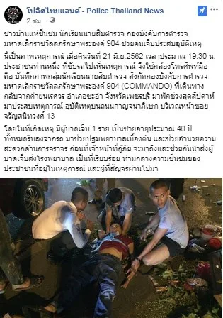 เป็นอีกหนึ่งเรื่องราวดีๆ ที่น่าชื่นชมกับกลุ่มนักเรียนนายสิบตำรวจกลุ่มนี้ โดยเมื่อช่วงดึกของคืนวันที่ 21 มิถุนายน 2562 ที่ผ่านมา เกิดอุบัติเหตุบนถนนกาญจนาภิเษก บริเวณหน้าซอยจรัญสนิทวงศ์ 13 ซึ่งมีผู้เห็นเหตุการณ์ได้บันทึกภาพขณะที่ นร.นายสิบตำรวจ กำลังให้การช่วยเหลือผู้ประสบอุบัติเหตุ ต่อมาเพจเฟซบุ๊กชื่อ “โปลิศไทยแลนด์ – Police Thailand News” ได้โพสต์ภาพและข้อความของเหตุการณ์ดังกล่าวระบุว่า “ชาวบ้านแห่ชื่นชม นักเรียนนายสิบตำรวจ กองบังคับการตำรวจ มหาดเล็กราชวัลลภรักษาพระองค์ 904 ช่วยคนเจ็บประสบอุบัติเหตุ นี้เป็นภาพเหตุการณ์ เมื่อคืนวันที่ 21 มิ.ย.2562 เวลาประมาณ 19.30 น. ประชาชนท่านหนึ่ง ที่ขับรถไปเห็นเหตุการณ์ จึงใช้กล้องโทรศัพท์มือถือ บันทึกภาพกลุ่มนักเรียนนายสิบตำรวจ สังกัดกองบังคับการตำรวจ มหาดเล็กราชวัลลภรักษาพระองค์ 904 (COMMANDO) ที่เดินทางกลับจากค่ายนเรศวร อำเภอชะอำ จังหวัดเพชรบุรี มาพักช่วงสุดสัปดาห์ มาประสบเหตุการณ์ อุบัติเหตุบนถนนกาญจนาภิเษก บริเวณหน้าซอยจรัญสนิทวงศ์ 13 โดยในที่เกิดเหตุ มีผู้บาดเจ็บ 1 ราย เป็นชายอายุประมาณ 40 ปี ทั้งหมดรีบลงจากรถ มาช่วยปฐมพยาบาลเบื้องต้น และช่วยอำนวยความสะดวกด้านการจราจร ก่อนที่เจ้าหน้าที่กู้ภัย จะมาถึงและช่วยกันนำส่งผู้บาดเจ็บส่งโรงพยาบาล เป็นที่เรียบร้อย ท่ามกลางความชื่นชมของประชาชนที่อยู่ในเหตุการณ์ และผู้ที่สัญจรผ่านไปมา”