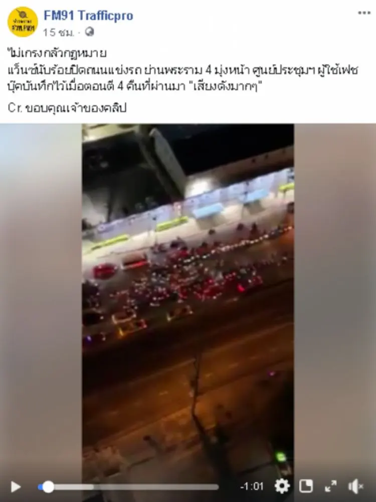 โดยคลิปดังกล่าว ทางเพจผู้ใใช้เฟซบุ๊กชื่อ FM91 Trafficpro ได้นำคลิปดังกล่าวมาเผยแพร่ พร้อมระบุข้อความว่า ไม่เกรงกลัวกฎหมาย แว้นนับร้อยปิดถนนแข่งรถย่านพระราม 4 มุ่งหน้า ศูนย์ประชุมฯ ผู้ใช้เฟชบุ๊กบันทึกไว้เมื่อตอนตี 4 คืนที่ผ่านมา เสียงดังมากๆ