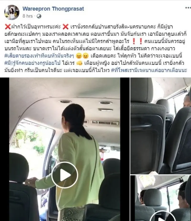 โดยสาวผู้โพสต์เรื่องราวดังกล่าวลงในโลกออนไลน์คือผู้ใช้เฟซบุ๊ค Wareepron Thongprasat ลัยบูรพา ฝากไว้เป็นอุทาหรณ์นะคะ เรานั่งรถกลับบ้านสายรังสิต-นครนายกคะ ก็มีผู้ชายลักษณะเเปลกๆ มองเราตลอดเวลาเลย ตอนเราขึ้นมา มันจับก้นเรา เอามือมาลูบเเล้วก็เอามือที่ลูบเราไปหอม คนในรถเห็นเเต่ไม่มีใครกล้าพูดอะไร คนเเบบนี้มันควรอยู่บนรถไหมละ