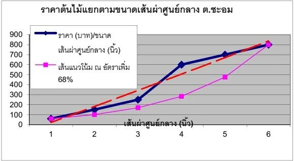 - ราคาขายต้นไม้ที่มีอายุ 1 ปี (ต้นไม้สูงประมาณ 2-3 เมตร ลำต้นใหญ่เส้นผ่าศูนย์กลาง 1-2 นิ้ว) ราคาขายต้นละประมาณ 20 บาท จำนวน 1,600 ต้น เป็นเงิน 32,000 บาท