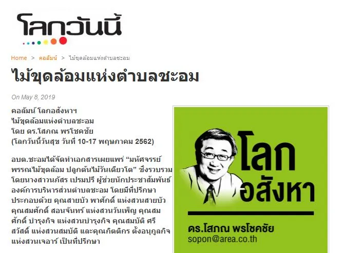 อ.บ.ต.ชะอม ได้จัดทำเอกสารเผยแพร่ “มหัศจรรย์พรรณไม้ขุดล้อม ปลูกต้นไม้ วันเดียวโต” ซึ่งรวบรวมโดยนางสาวนภัสร เปรมปรี ผู้ช่วยนักประชาสัมพันธ์ องค์การบริหารส่วนตำบลชะอม โดยมีที่ปรึกษาประกอบด้วย คุณสายบัว พาศักดิ์ แห่งสวนสายบัว คุณสมศักดิ์ สอนจันทร์ แห่งสวนวันเพ็ญ คุณสมศักดิ์ บำรุงกิจ แห่งสวนบำรุงกิจ คุณสมบัติ ศรีสวัสดิ์ แห่งสวนสมบัติ และคุณกิตติกร ตั้งอนุกูลกิจ แห่งสวนเจอาร์ เป็นที่ปรึกษา