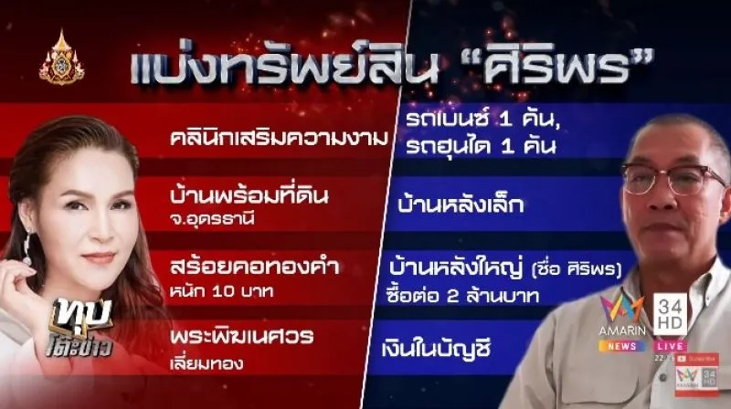 ในส่วนของสมบัติที่แบ่งกันนั้น ส่วนที่ศิริพรได้ไป คือ คลินิกเสริมความงาม, บ้านพร้อมที่ดินที่ จ.อุดรธานี, สร้อยคอทองคำ หนัก 10 บาท พระพิฆเนศวรเลี่ยมทอง ส่วนสมบัติที่ตนไปได้นั้นคือ รถเบนซ์ 1 คัน, รถฮุนได 1 คัน, บ้านหลังเล็ก, เงินในบัญชี และบ้านหลังใหญ่ที่ซื้อต่อจากศิริพร 2 ล้านบาท