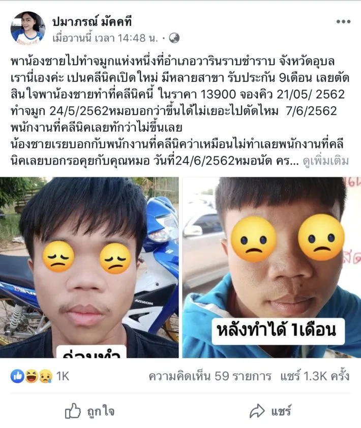เป็นที่วิจารณ์สนั่นโลกออนไลน์ โดยชื่อผู้ใช้ Facebook ปมาภรณ์ มัคคที ได้โพสต์ภาพน้องชายที่ไปเสริมดั้งจมูกที่คลิกนิกศัลยกรรมแห่งหนึ่งในจ.อุบลราชธานี ปรากฏว่าเวลาผ่านไป 1 เดือนดูเหมือนว่าไม่มีอะไรแตกต่างจากก่อนหน้าผ่าตัดเสริมดั้งเลยโดยผู้โพสต์ระบุว่า