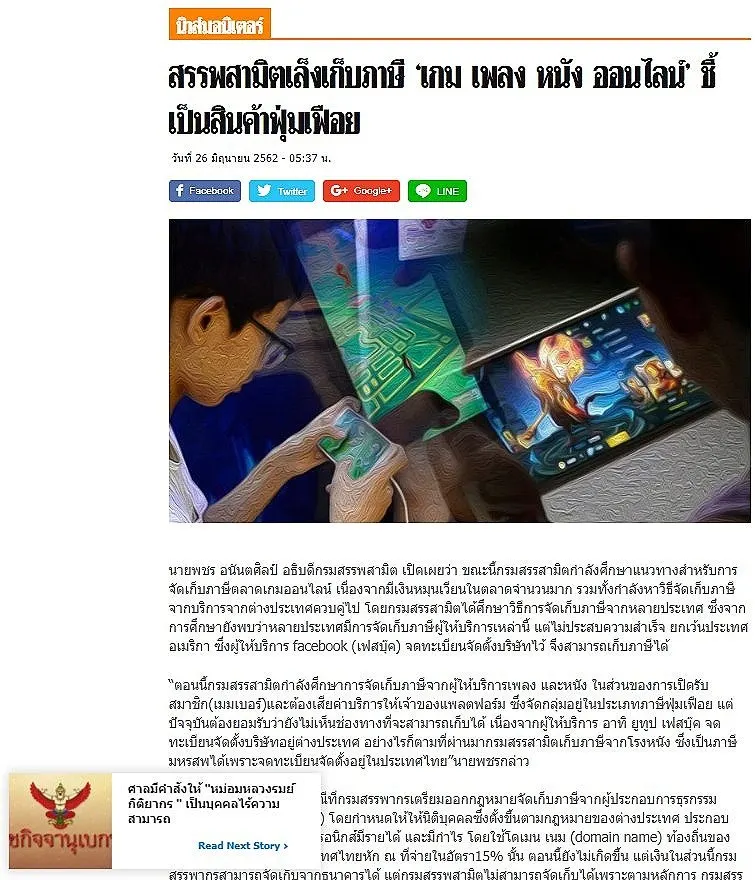 26 มิ.ย. 2562 ผู้สื่อข่าวรายงานว่า กรมสรรพสามิตกำลังศึกษาแนวทางสำหรับการจัดเก็บภาษีตลาดเกมออนไลน์ เนื่องจากมีเงินหมุนเวียนในตลาดจำนวนมาก รวมทั้งกำลังหาวิธีจัดเก็บภาษีจากบริการจากต่างประเทศควบคู่ไป