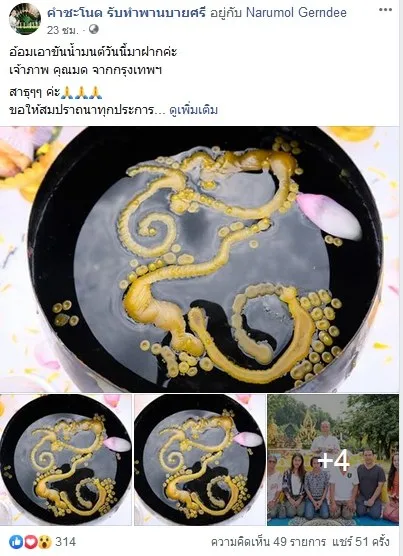 ล่าสุดทางด้นผู้ใช้เฟสบุ๊กคำชะโนด รับทำพานบายศรีได้ออมาเผยแพร่รูปขันน้ำมนต์หลังจากทำพิธีอันศักดิ์สิทธิ์เสร็จแล้วพร้อมระบุข้อความเอาไว้ว่า อ้อมเอาขันน้ำมนต์วันนี้มาฝากค่ะ เจ้าภาพ คุณมด จากกรุงเทพฯ สาธุๆๆ ค่ะ ขอให้สมปราถนาทุกประการ อ้อมคำชะโนด