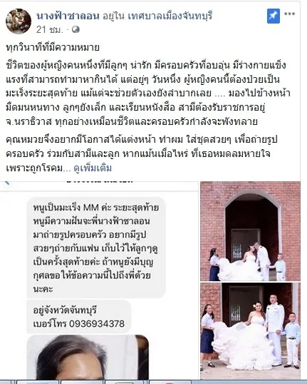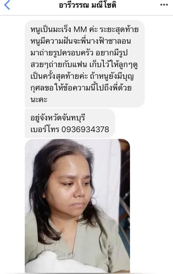 เมื่อวันที่ 26 มิ.ย. 62 ทางด้านผู้ใช้เฟสบุ๊กนางฟ้าซาลอนได้ออกมาเผยแพร่เรื่อง สุดสะเทือนใจพร้อมระบุข้อความเอาไว้าว่าทุกวินาทีที่มีความหมายชีวิตของผู้หญิงคนหนึ่งที่มีลูกๆ น่ารัก มีครอบครัวที่อบอุ่น มีร่างกายแข็งแรงที่สามารถทำมาหากินได้ แต่อยู่ๆ วันหนึ่ง ผู้หญิงคนนี้ต้องป่วยเป็นมะเร็งระยะสุดท้าย แม้แต่จะช่วยตัวเองยังลำบากเลย มองไปข้างหน้ามืดมนหนทาง ลูกๆยังเล็ก และเรียนหนังสือ สามีต้องรับราชการอยู่ จ.นราธิวาส ทุกอย่างเหมือนชีวิตและครอบครัวกำลังจะพังทลาย
