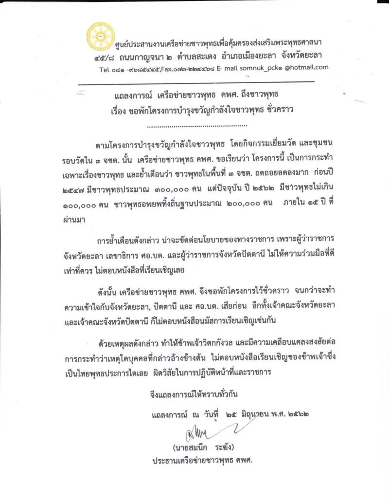 เครือข่ายชาวพุทธโวย ผู้ว่าฯปัตตานี/ยะลา-เจ้าคณะจังหวัดไม่อนุมัติงบ