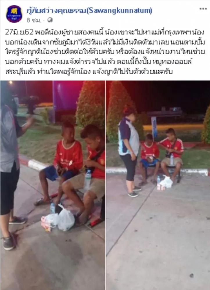 28 มิถุนายน เพจผู้ใช้เฟซบุ๊กชื่อ กู้ภัยสว่างคุณธรรม(Sawangkunnatum) ได้เผยแพร่เรื่องราวของหนูน้อยทั้งสองคน เดินจากชัยภูมิ จะไปหาแม่ที่ กทม. ไม่มีเงิน-นอนตามปั๊ม กู้ภัยโพสต์ตามหาญาติเด็ก ช่วย โดยเจ้าของเพจได้ระบุข้อความว่า 27มิ.ย.62 พอดีน้องผู้ชายสองคนนี้ น้องเขาจะไปหาแม่ที่กรุงเทพฯ น้องบอกน้องเดินจากชัยภูมิมาได้ 3 วันแล้วไม่มีเงินติดตัวมาเลย นอนตามปั้ม ใครรู้จักญาติน้องช่วยติดต่อให้ด้วยครับ หรือต้องแจ้งหน่วยงานไหนช่วยบอกด้วยครับ ทางผมแจ้งตำรวจไปแล้ว ตอนนี้ถึงปั๊ม หมูทองออยล์ สระบุรีแล้ว ท่านใดพอรู้จักน้อง แจ้งญาติไปรับตัวด้วยนะครับ