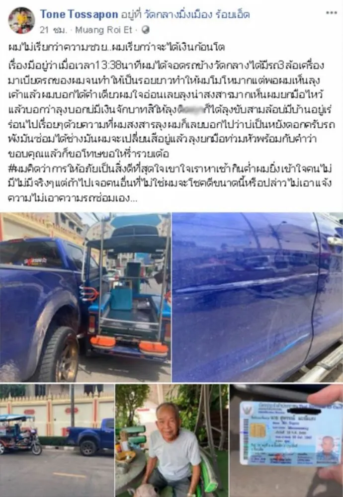 วันที่ 28 มิถุนายน เพจผู้ใช้เฟซบุ๊กชื่อ Tone Tossapon โดยได้เผยแพร่เรื่องราวระบุข้อความว่า ผมไม่เรียกว่าความซวย ผมเรียกว่าจะได้เงินก้อนโต เรื่องมีอยู่ว่าเมื่อเวลา 13:38 นาทีผมได้จอดรถข้างวัดกลางได้มีรถ 3 ล้อเครื่องมาเบียดรถของผมจนทำให้เป็นรอยยาวทำให้ผมโมโหมากแต่พอผมเห็นลุงเค้าแล้วผมบอกได้คำเดียวผมใจอ่อนเลยลุงน่าสงสารมากเห็นผมยกมือไหว้แล้วบอกว่าลุงบอกบ่มีเงินจักบาทสิลุงขับสามล้อบ่มีบ้านอยู่เร่ร่อนไปเรื่อยๆด้วยความที่ผมสงสารลุงผมก็เลยบอกไปว่าบ่เป็นหยังดอกครับรถพังมันซ่อมได้ช่างมันผมจะเปลี่ยนสีอยู่แล้วลุงยกมือท่วมหัวพร้อมกับคำว่าขอบคุณแล้วก็ขอโทษขอให้ร่ำรวยเด้อ #ผมคิดว่าการให้อภัยเป็นสิ่งดีที่สุดใจเขาใจเราหาเช้ากินค่ำผมยิ่งเข้าใจคนไม่มีไม่มีจริงๆแต่ถ้าไปเจอคนอื่นที่ไม่ใช่ผมจะโชคดีขนาดนี้หรือปล่าวไม่เอาแจ้งความไม่เอาความรถซ่อมเอง