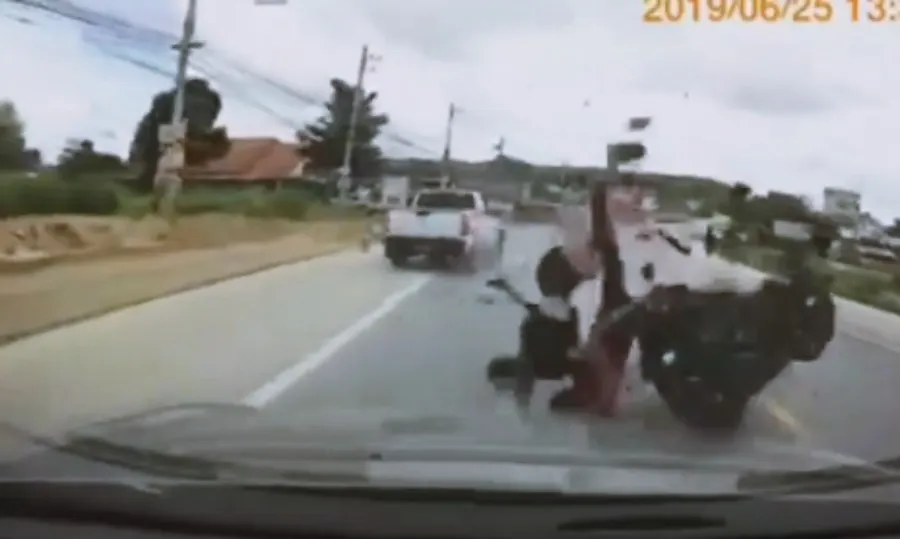 คลิปจากกล้องหน้ารถได้เผยภาพนาทีรถบิ๊กไบค์ สีดำ ซิ่งแหกโค้งบนถนนสายมาบยางพร อ.ปลวกแดง จ.ระยอง ก่อนพุ่งชนรถกระบะป้ายแดง และกระเด็นไปชนรถเบนซ์อีกที เป็นเหตุให้คนขี่บิ๊กไบค์เป็นชายได้เสียชีวิตทันที ส่วนคนซ้อนทัายได้รับบาดเจ็บสาหัส