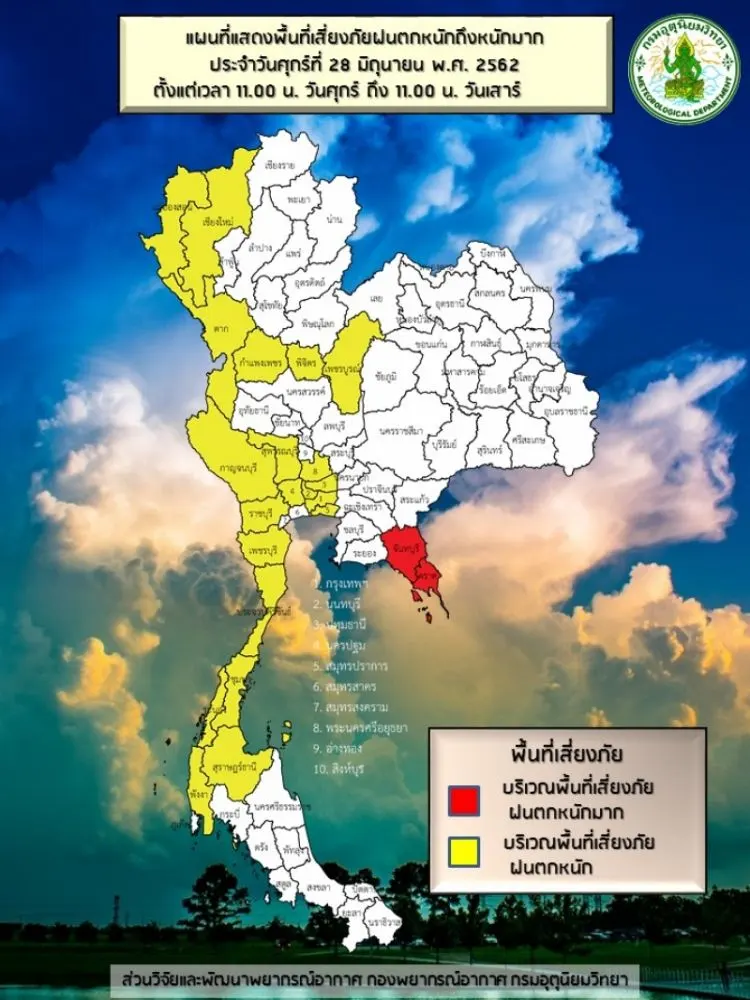 เว็บไซต์กรมอุตุนิยมวิทยาระบุ 2 จังหวัดเป็นพื้นที่สีแดงเสี่ยงภัยฝนตกหนักมากประจำวันที่ 28 มิถุนายน 2562 โดยประกอบด้วยจังหวัดจันทบุรี และจังหวัดตราด ส่วนจังหวัดที่เหลืออีกหลายจังหวัดเป็นพื้นที่สีเหลือง เสี่ยงฝนตกหนัก