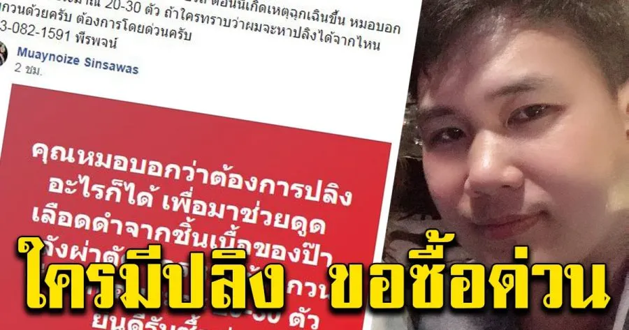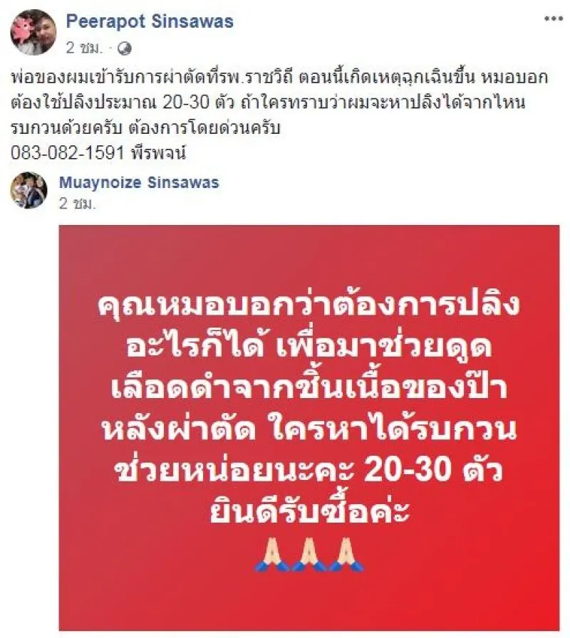ทั้งนี้ ผู้ใช้เฟซบุ๊กรายดังกล่าว ได้แชร์โพสต์ของผู้ใช้เฟซบุ๊ก Muaynoize Sinsawas ซึ่งระบุข้อความว่า “คุณหมอบอกว่าต้องการปลิงอะไรก็ได้ เพื่อมาช่วยดูดเลือดดำจากชิ้นเนื้อของป๊าหลังผ่าตัด ใครหาได้รบกวนช่วยหน่อยนะคะ 20-30 ตัว ยินดีรับซื้อค่ะ”