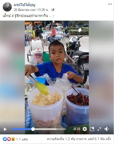 นับว่าเป็นอีกหนึ่งเรื่องราวดีๆ ที่ชาวโซเชียลให้ความสนใจเข้ามาแสดงความคิดเห็นและแชร์กันเป็นจำนวนมาก สำหรับคลิปวิดีโอหนูน้อยยอดกตัญญูที่ช่วยแม่ทำมาหากิน ซึ่งชาวโซเชียลต่างพากันแสดงความคิดเห็นชื่นชมหนูน้อยคนดังกล่าว ว่าเป็นเด็กดีกตัญญูรู้คุณ ขยันช่วยแบ่งเบาภาระพ่อแม่ และยังเป็นตัวอย่างที่ดีให้กับเด็กๆ คนอืนๆ อีกหลายคน ทั้งนี้เมื่อวันที่ 26 มิถุนายน 2562 ที่ผ่านมา ได้มีผู้ใช้เพจเฟซบุ๊กชื่อ “แชร์ไปได้บุญ” โพสต์คลิปวิดีโอพร้อมข้อความระบุว่า “เด็ก ป.4 รู้จักช่วยแม่ทำมาหากิน” ซึ่งเป็นภาพน่ารักๆ ของหนูน้อยที่กำลังช่วยคุณแม่ขายของอย่างขยันขันแข็ง