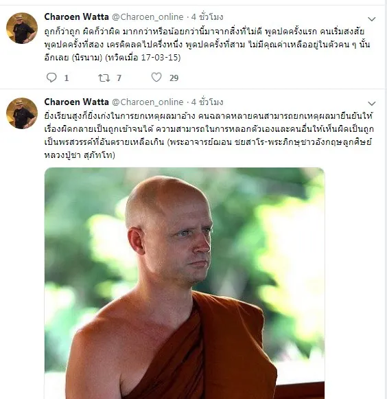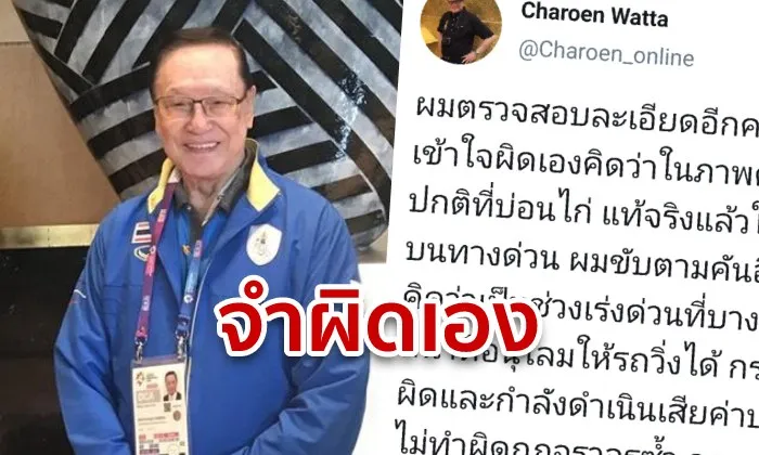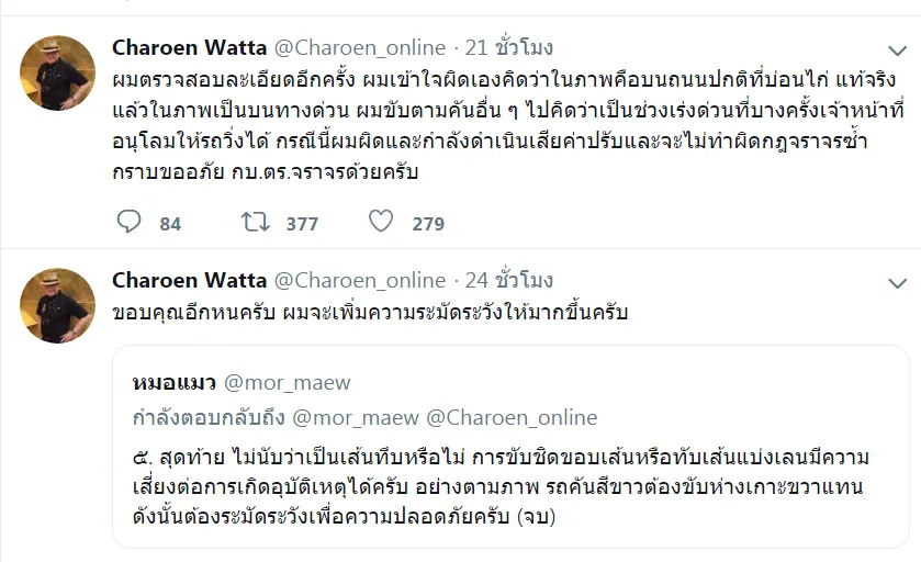 ข้อความที่ทวิตไว้ คือ "ผมตรวจสอบละเอียดอีกครั้ง ผมเข้าใจผิดเองคิดว่าในภาพคือบนถนนปกติที่บ่อนไก่ แท้จริงแล้วในภาพเป็นบนทางด่วน ผมขับตามคันอื่น ๆ ไปคิดว่าเป็นช่วงเร่งด่วนที่บางครั้งเจ้าหน้าที่อนุโลมให้รถวิ่งได้ กรณีนี้ผมผิดและกำลังดำเนินเสียค่าปรับและจะไม่ทำผิดกฎจราจรซ้ำ กราบขออภัย กบ.ตร.จราจรด้วยครับ"