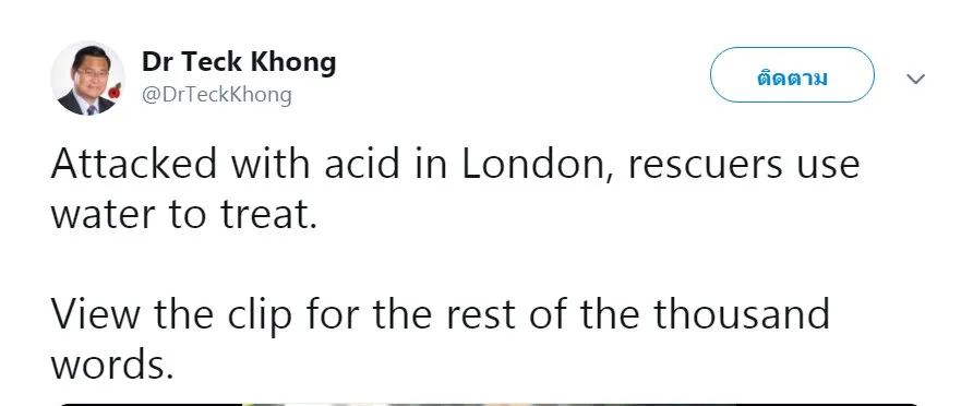 ตร ลอนดอน กลับมาเตือนให้ระวังการถูกทำร้ายด้วยน้ำกรด เนื่องจากช่วงนี้พบการก่อเหตุทำร้ายร่างกายด้วยน้ำกรดกลับมาเพิ่มขึ้น บางเคสเป็นคู่อริ บางเคสโจรใช้วิธีสาดน้ำกรดใส่เหยื่อแล้วชิงทรัพย์ บางเคสเดินๆอยู่ก็โดน ไม่ได้มีเรื่องอะไรกัน