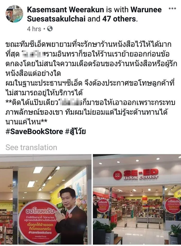 📚"ทีมซีเอ็ดพยายามที่จะรักษาร้านหนังสือไว้ให้ได้มากที่สุด" แต่"ให้ร้านเราย้ายออกก่อนข้อตกลงโดยไม่สนใจความเดือดร้อนของร้านหนังสือ"