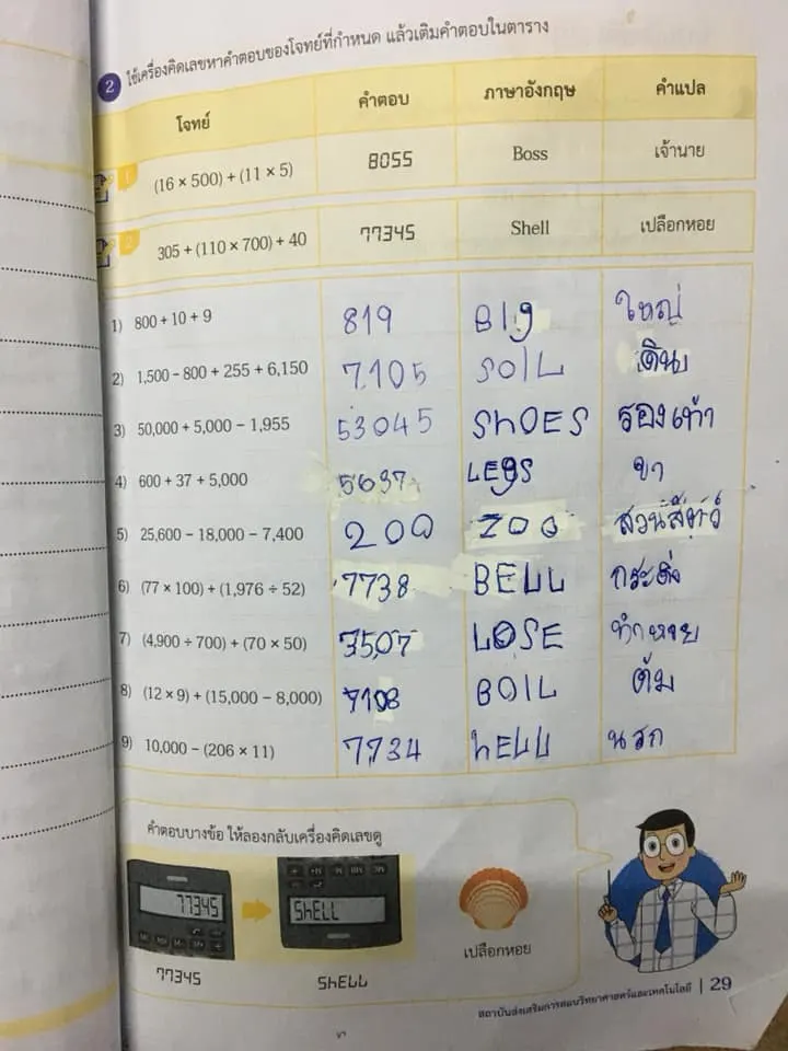 โดยเป็นการบวกลบเลข คำตอบออกมาเป็น 4 หลัก จากนั้นก็เอาเลข 4 หลักที่เป็นคำตอบ ตีความหมายให้เป็นภาษาอังกฤษให้ออก เช่น 8055 ก็เป็น BOSS