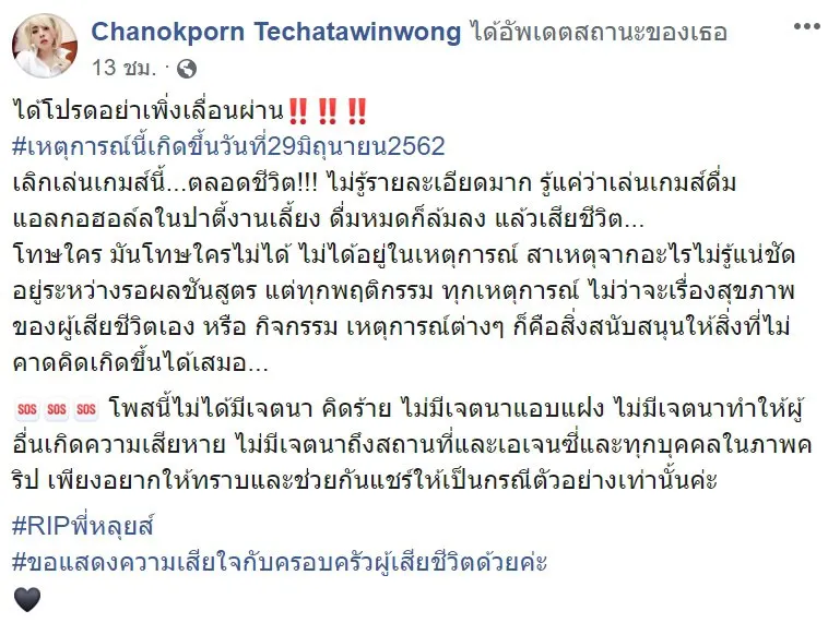 อุทาหรณ์เตือนใจนักดื่ม หนุ่มแข่งกระดกเบียร์รวดเดียว 1เหยือก ดับสลด! วันที่ 1 กรกฎาคม 2562 สมาชิกผู้ใช้เฟซบุ๊กที่ชื่อ Chanokporn Techatawinwong ได้แชร์เรื่องราวสุดสลด พร้อมอุทาหรณ์เตือนใจสิงห์นักดื่ม ระบุว่ามีหนุ่มรายหนึ่งเล่นเกมแข่งกระดกเครื่องเบียร์ 1 เหยือก รวดเดียว หลังจากดื่มหมดชายหนุ่มคนนี้ก็ล้มลง แล้วเสียชีวิตในเวลาต่อมา อย่างไรก็ตามยังไม่สรุปสาเหตุการเสียชีวิตที่ชัดเจน ต้องรอผลชันสูตรอีกครั้ง